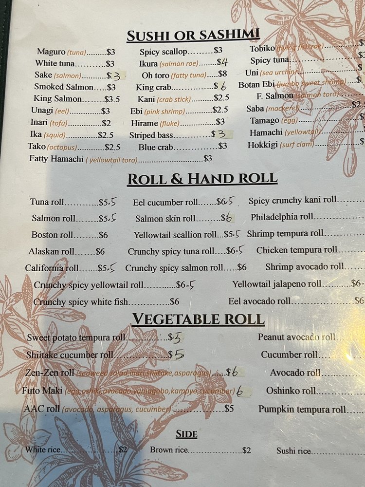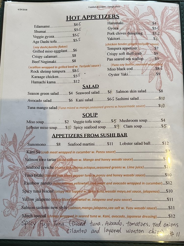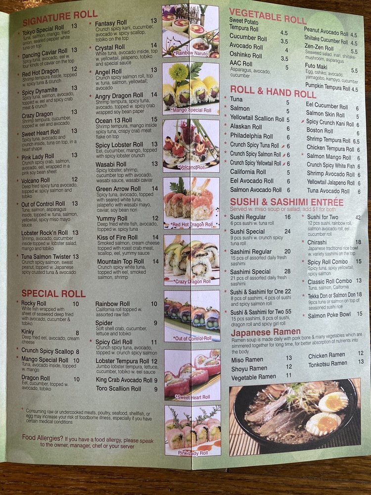 White tuna and avocado inside, topped with yellowtail, jalapeno, tobiko and special sauce.