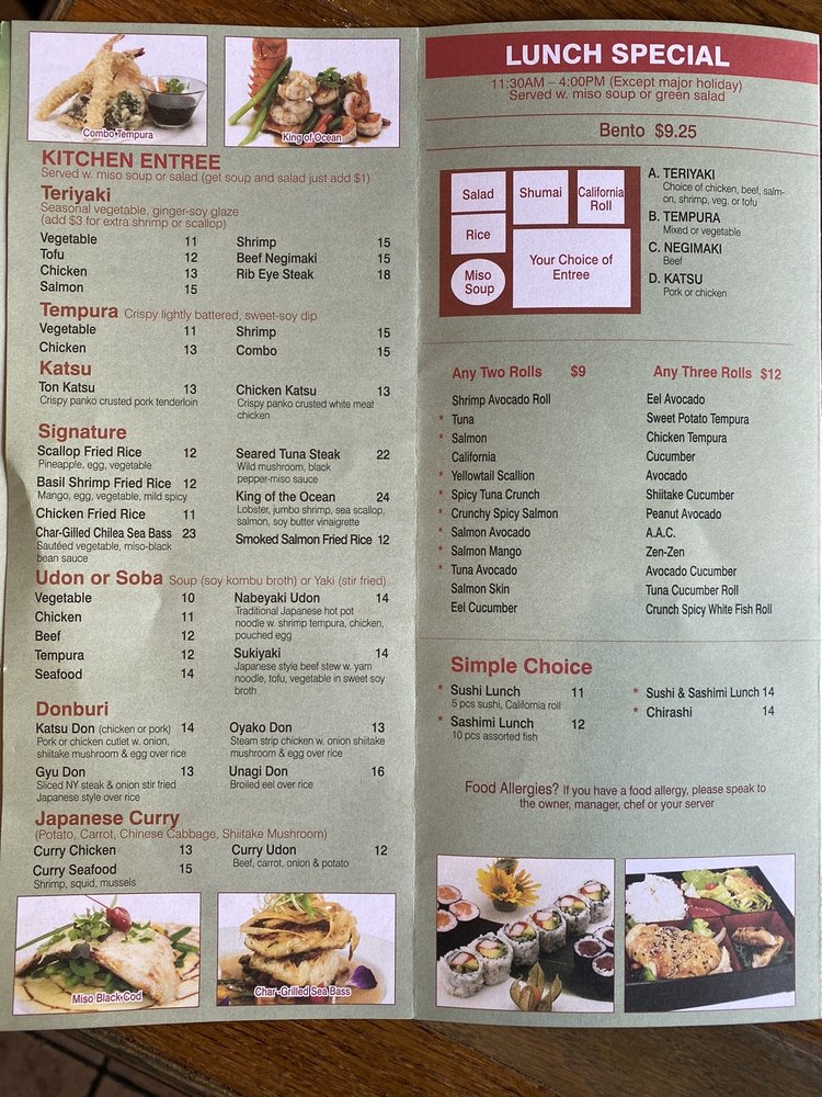 Served with 4 piece California roll, 1 serving of shumai, 1 green salad, 1 white rice bowl and 1 miso soup.